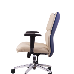 پایه این صندلی اداری فلزی است که به منظور مقاومت بیشتر و جلوگیری از زنگ زدگی با کروم آبکاری شده است و همین امر دلیل زیبایی و درخشندگی بسیار این صندلی مدیریتی است. ضمنا طراحی پایه صندلی به شکل پنج پر فلزی با چرخ های پلاستیکی موجب تسهیل در جابه جایی شده است.