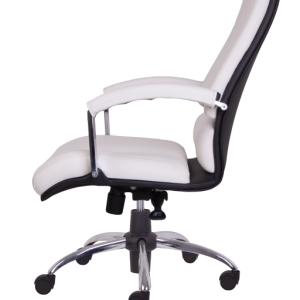 پایه این صندلی اداری فلزی است که به منظور مقاومت بیشتر و جلوگیری از زنگ زدگی با کروم آبکاری شده است و همین امر دلیل زیبایی و درخشندگی بسیار این صندلی مدیریتی است. ضمنا طراحی پایه صندلی به شکل پنج پر فلزی با چرخ های پلاستیکی موجب تسهیل در جابه جایی شده است.