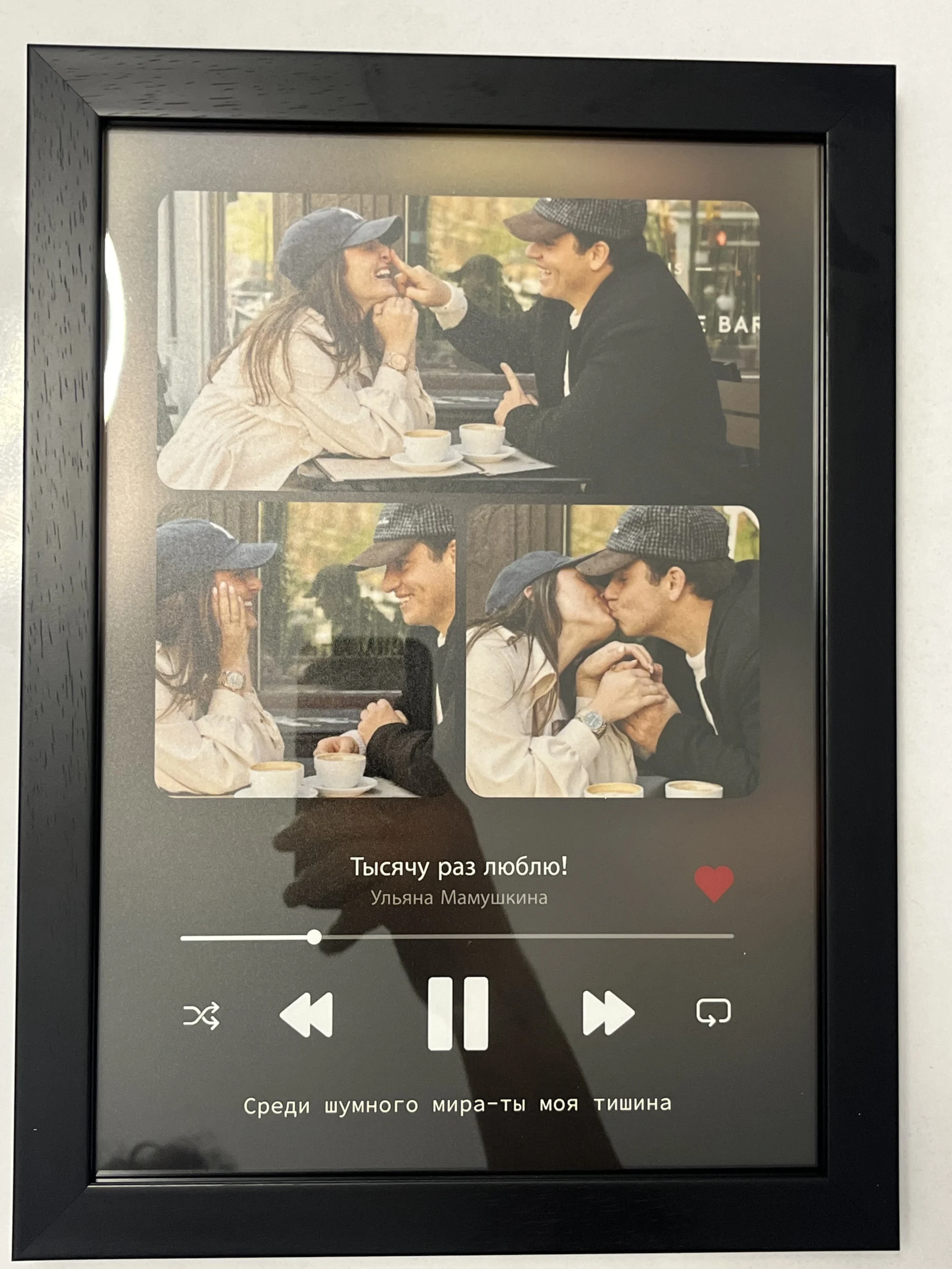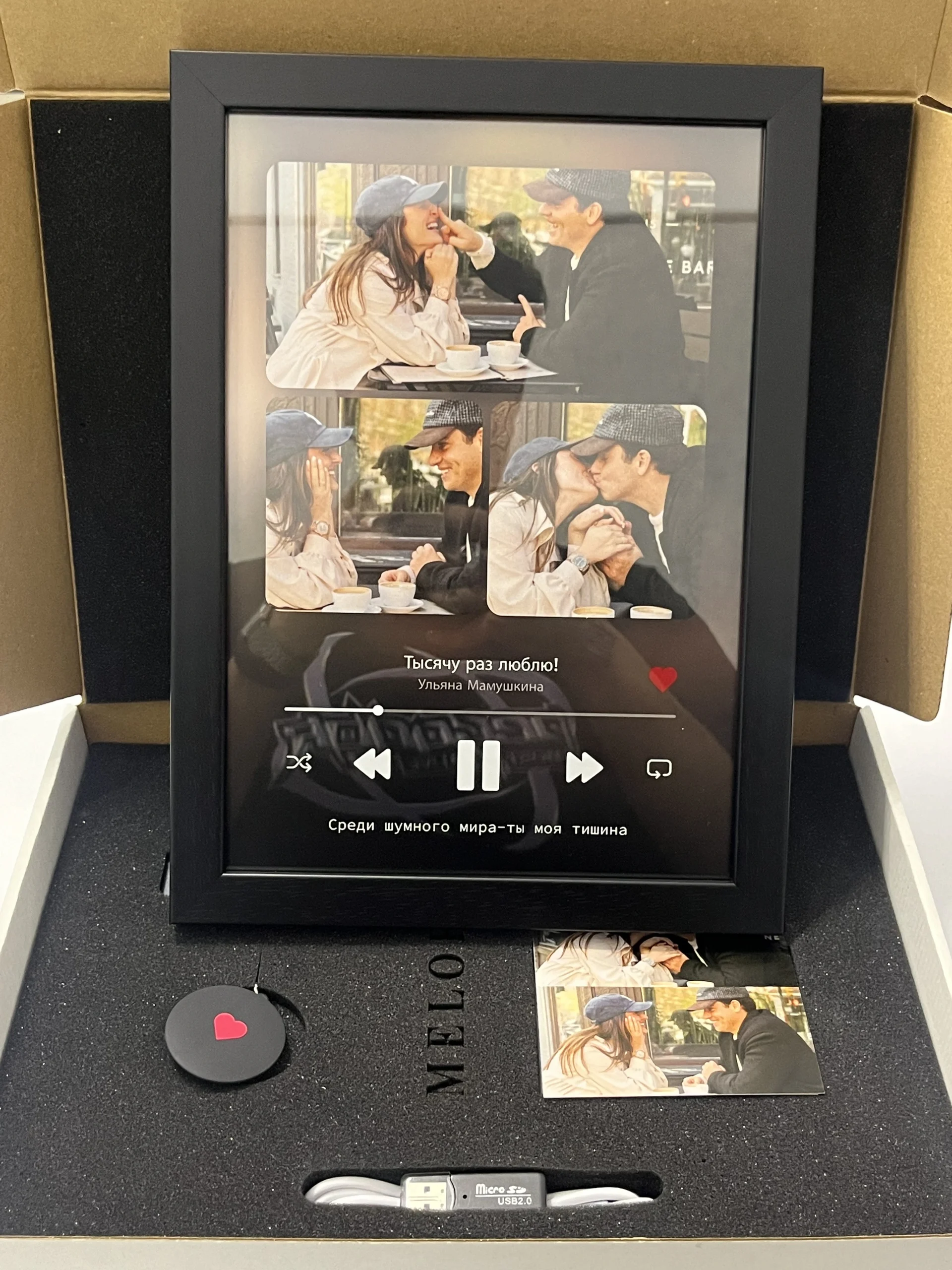 چیدمان تصاویر در قاب بهصورت چندبخشی انجام شده و روایتگر یک خاطره صمیمی و عاشقانه است. این تابلو فقط یک قاب عکس نیست؛ روایتی شنیداری از یک لحظه خاص است که میتواند هر بار با پخش موسیقی، احساس همان لحظه را تداعی کند.