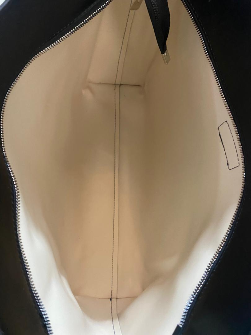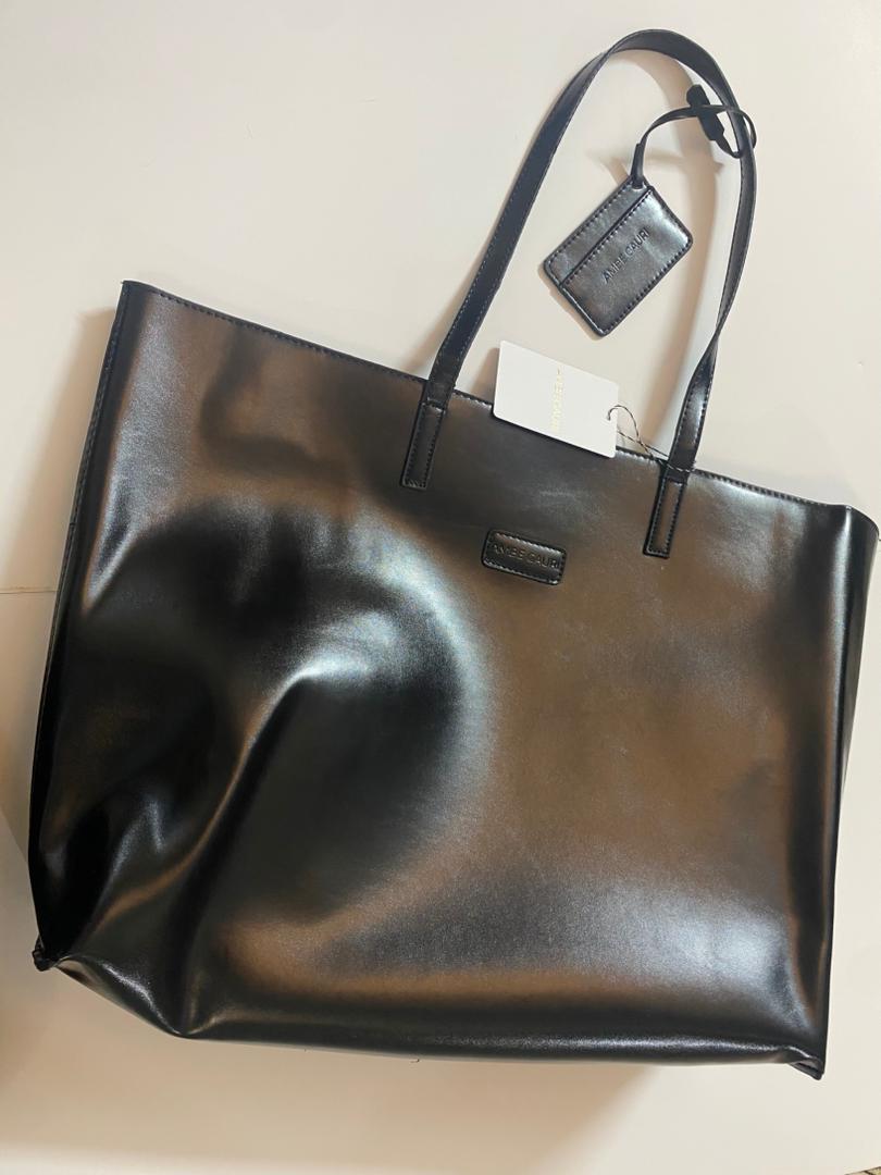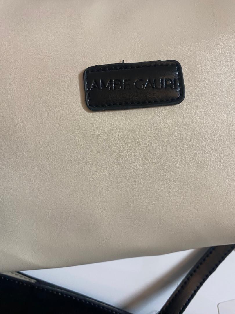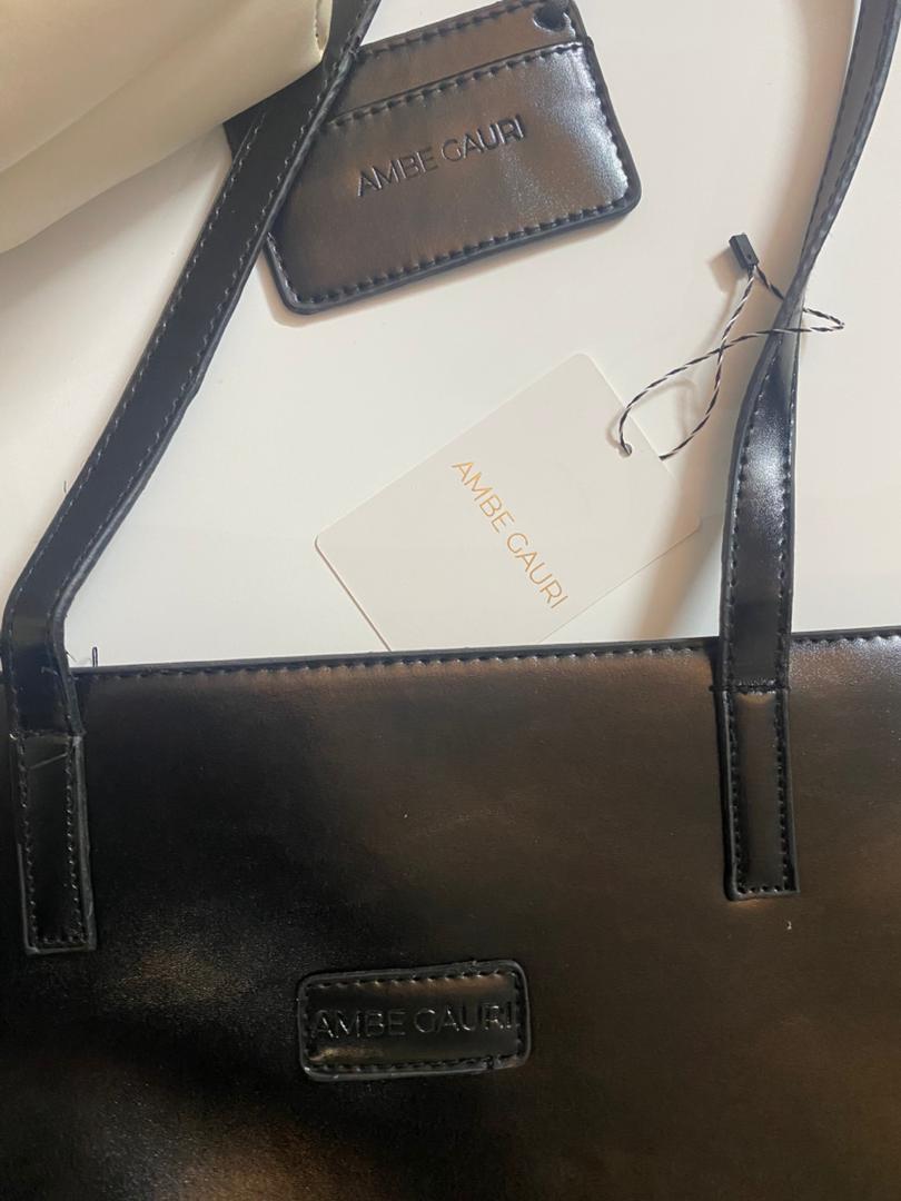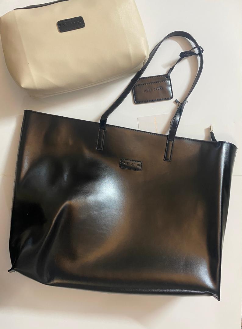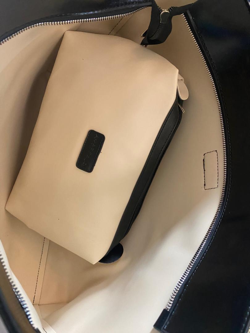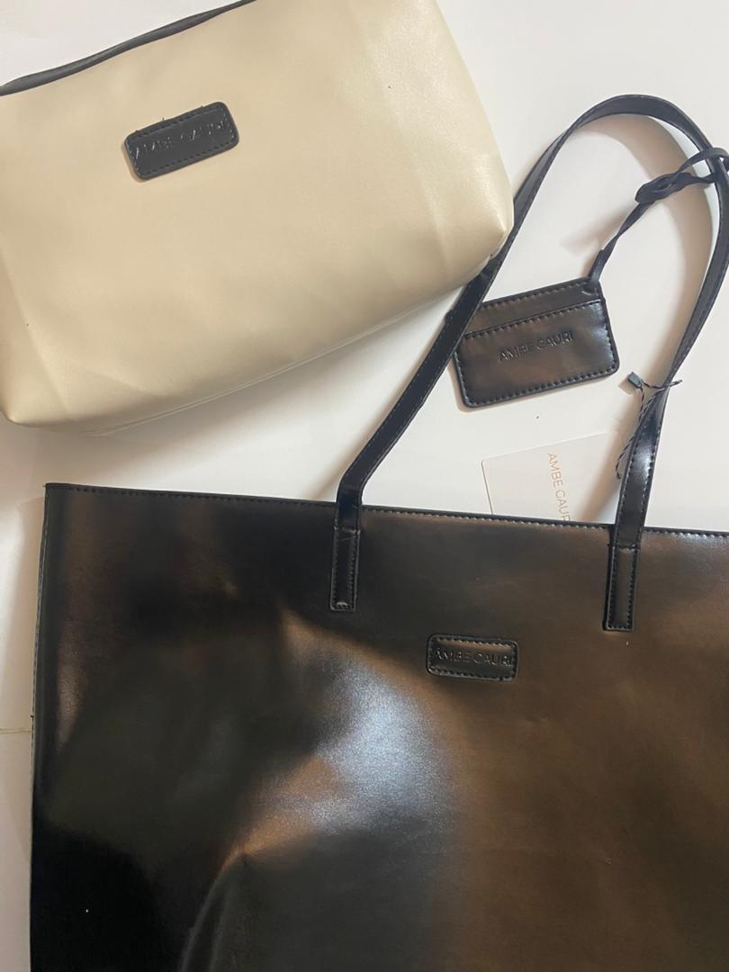 A stylish and practical black synthetic leather handbag featuring a detachable cream-colored makeup pouch—perfect for keeping your essentials organized. Designed for everyday elegance, this spacious bag combines functionality with a timeless look.