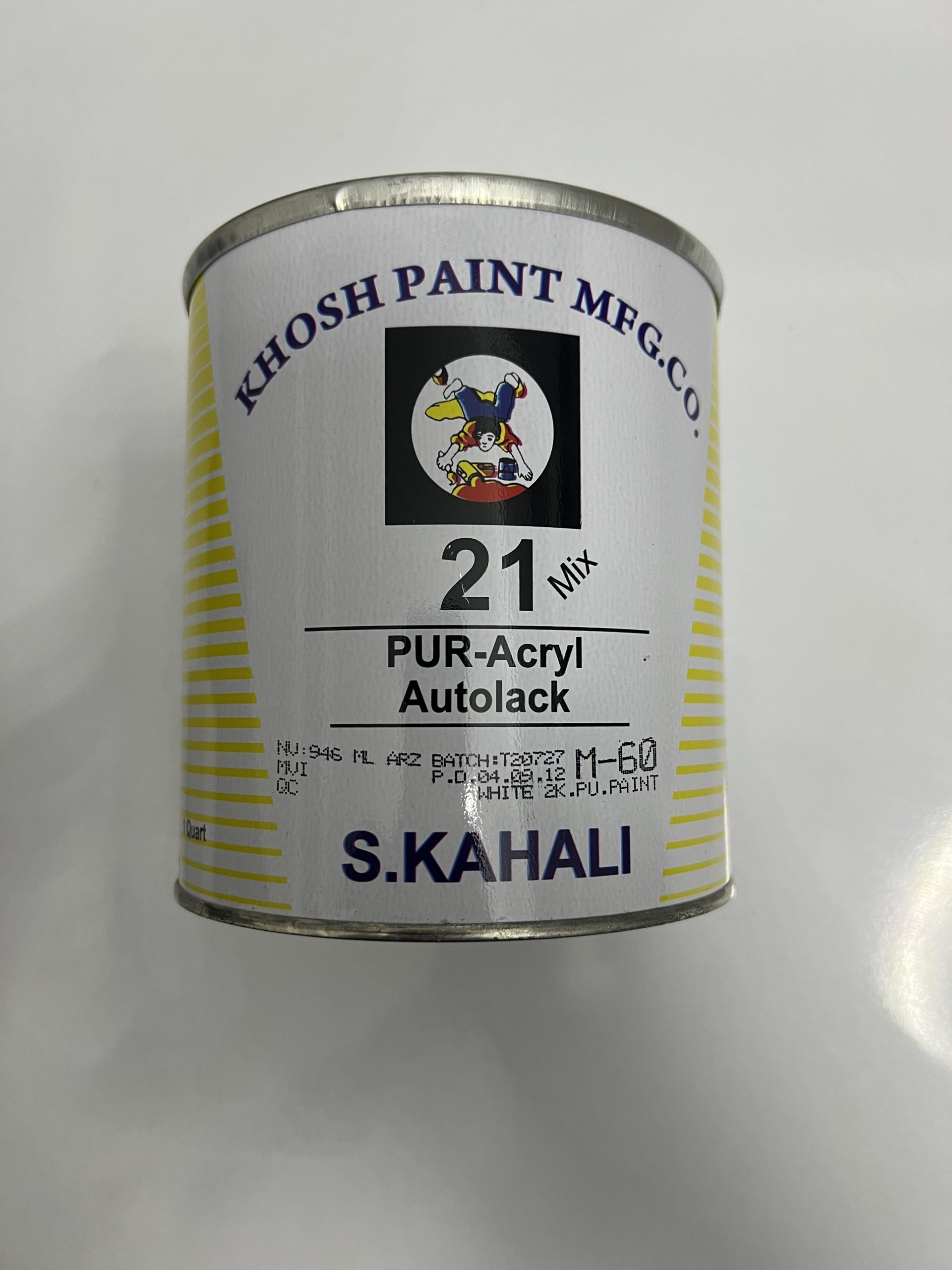 Khosh Automotive Paint is a high-quality automotive coating designed for professional vehicle body finishing. The White M-60 color provides excellent coverage, smooth appearance, and durable performance. This paint is suitable for automotive body repair and refinishing applications, delivering a uniform and glossy finish when applied under standard conditions.
