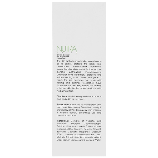 Nutra Creamy Cleanser with Probiotics Nutra Creamy Cleanser with a unique formulation and hydrating properties is a suitable choice for washing all skin types, especially those with dry, sensitive and eczema-prone skin. This sulfate-free product uses a proprietary probiotic and postbiotic formulation enriched with marigold extract, urea, beeswax, sodium lactate and glycerin without removing natural oils and maintaining skin moisture, removes impurities, chemicals and makeup, and balances the skin’s surface to protect it from harmful environmental factors and soothes skin irritations.