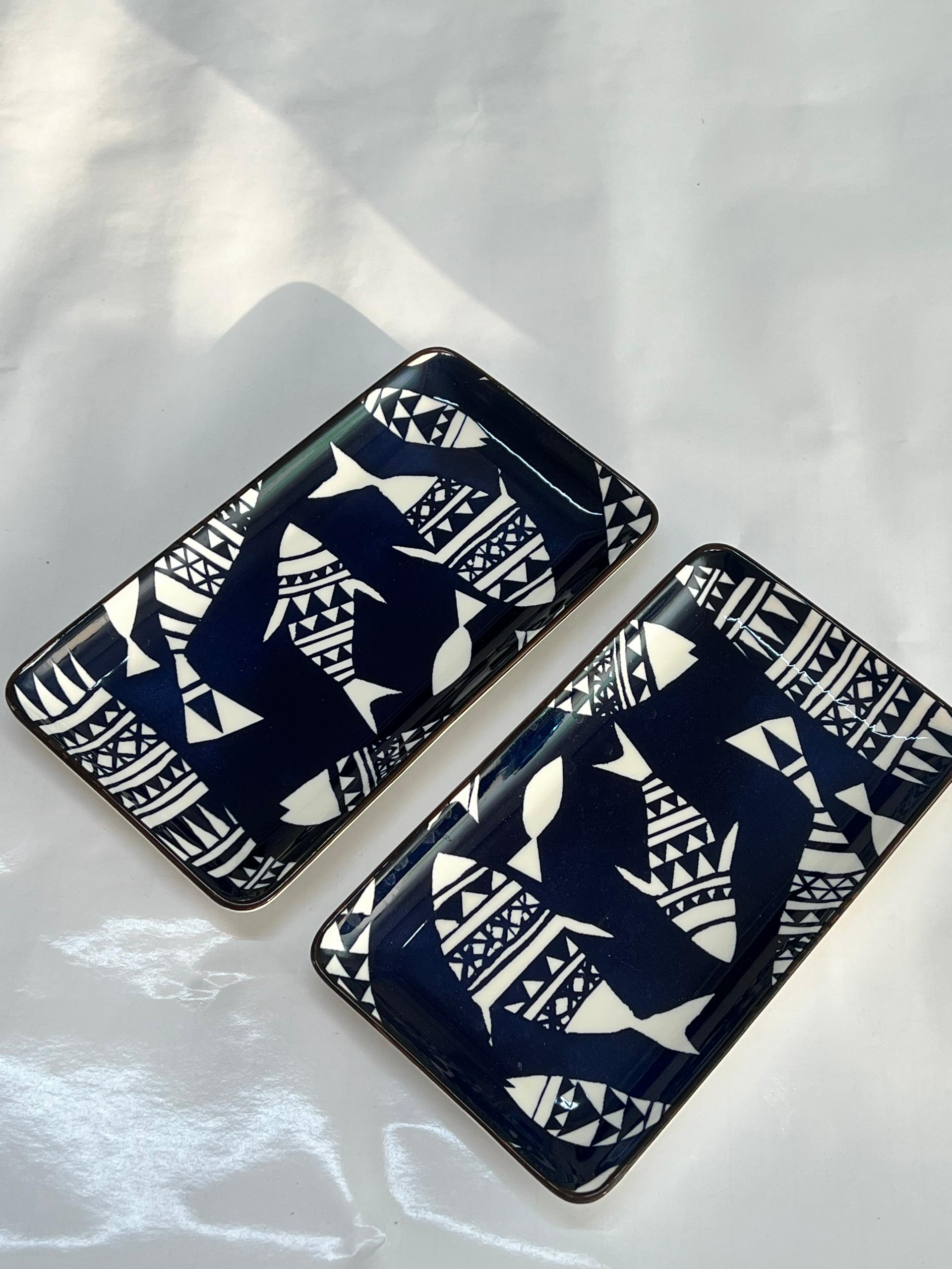 Set of 2 Small Ceramic Trays (22×13 cm – Single Pieces – Navy with Fish Design)